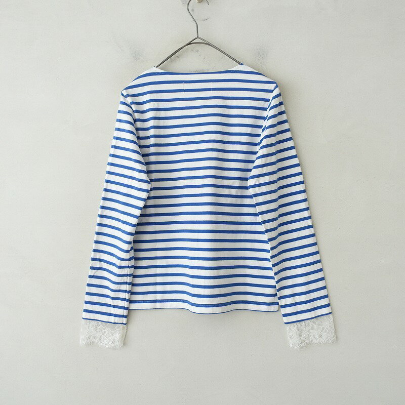 表記サイズ:38 実寸サイズ:肩幅36cm, 身幅43cm, 袖丈(レース含む)61cm, 着丈55cm, スリット9cm (多少の誤差はご了承ください) 素材:コットン100% レース-ナイロン81%,コットン19% デザイン:nesessaireのレース付きコットンボーダーカットソーです。