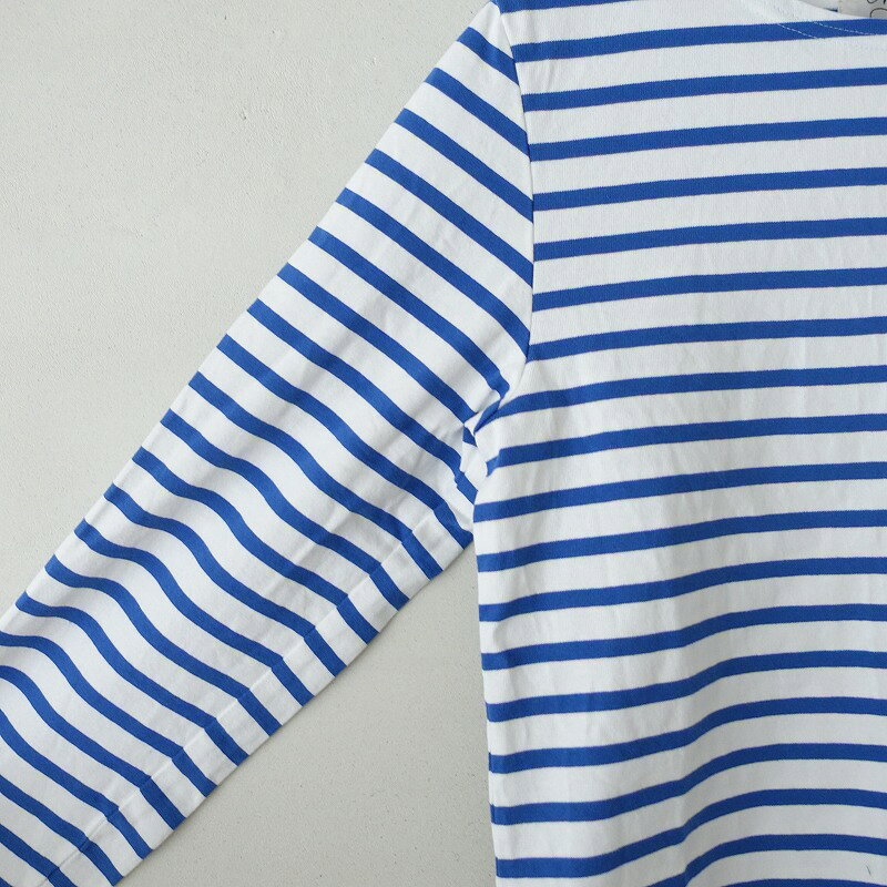 カラーはホワイト、ブルーのボーダーで、コットンの天竺地で仕立てられています。