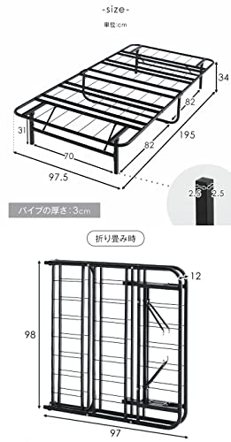 商品情報商品の説明【スタッフ のおすすめポイント!】 ・らくらく折りたたみ式 ・使わない時はコンパクトに収納可能 ・安定性に優れたU字脚を採用 ・桟フレーム本数UPで頑丈に! ・たっぷり収納 ベッド下31cm ・品質保証の証 ISO認証工場で生産 ・床傷防止キャップ付き主な仕様 【サイズ】外寸:幅97.5×奥行195×高さ34cm 折りたたみ時:幅97×奥行12×高さ98cmbr【重量】約13kg【耐荷重】約200kg(静止耐荷重)br【素材】スチール(粉体塗装)、傷防止キャップ×6個:PP【生産国】中国【梱包サイズ】幅101×奥行37.5×高さ21cm【組立品】br※2022年10月21日より新仕様にリニューアルし、4つ折りタイプから2つ折りタイプに変更しました。