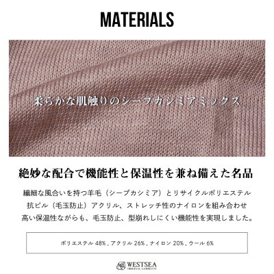 2021-2022秋冬のウエストシーは機能性も重視してさらにパワーアップ!! 【素材感】 やや薄手と繊細な編み目ですが、絶妙な配合で強度の高い素材を使用 化学繊維とは思えない柔らかな肌触りと保温性。