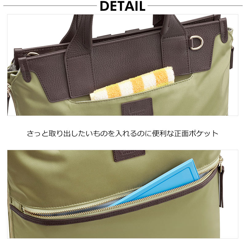 内装:ペットボトルを再利用したリサイクルポリエステルを使用 商品番号 17315 素材 リサイクルナイロン100dnツイル/PVC加工/牛革 サイズ(約) H35×W29/46×D15cm 容量(約) 13L 重さ(約) 約650g 生産国 CHINA 仕様 前面…ファスナーポケット×1、オープンポケットx1 背面...ファスナーポケット(内側ポケットx1) 内側…マチ付きオープンポケット×2、ペットボトルホルダーx1 ※記載サイズは概寸です。