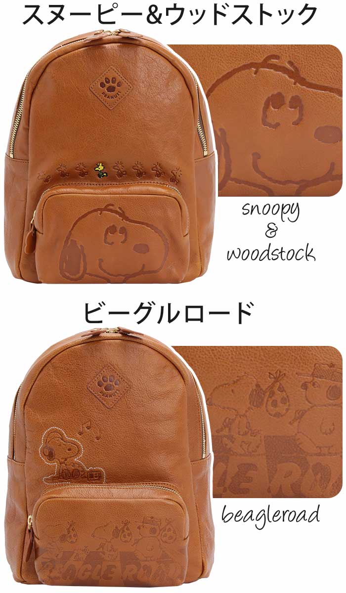 リュック かわいい PEANUTS ピーナッツ SNOOPY スヌーピー 本革 リュックサック レザー 大人リュック バックパック ウッドストック ビーグル 牛革 型押し おしゃれ 大人可愛い 大人 小さめ ブラウン リアルレザー 人気 街用 旅行 軽量 14181、14182