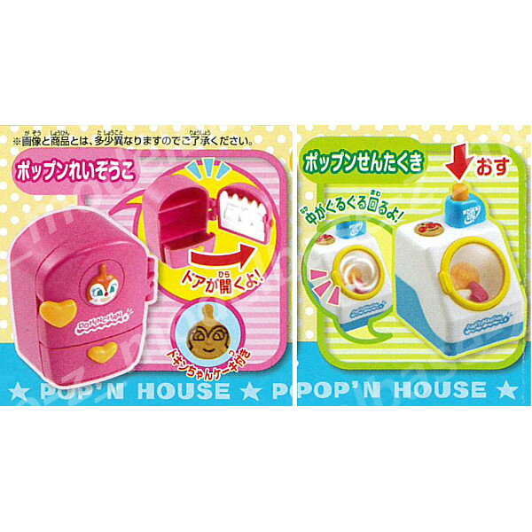 ● ポップンせんたくき (洗剤を押すと中のドラムがまわるよ!)←ギミック ● ポップンれいぞうこ (ドアをあけるとドキンちゃんの ケーキが入っているよ!) の2種類 です。