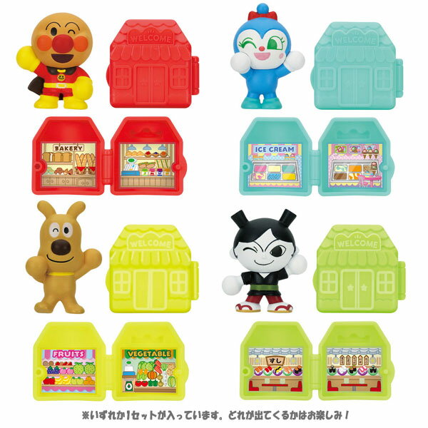 【ラインナップ (全4種)】 ・アンパンマン&ハウス(パンやさん) ・コキンちゃん&ハウス(アイスやさん) ・めいけんチーズ&ハウス(やおやさん) ・てっかのマキちゃん&ハウス(おすしやさん) ※いずれかひとつが入っています。
