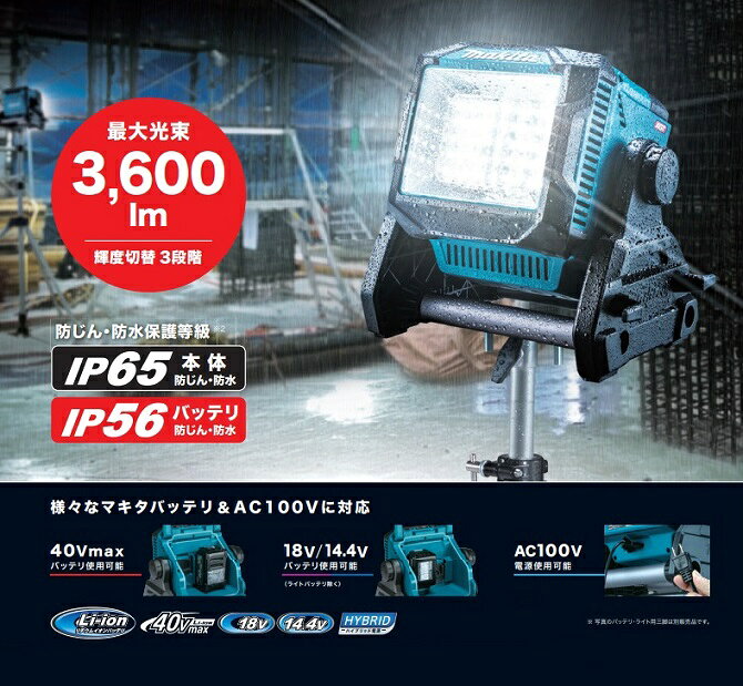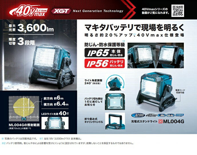 マキタ ML004G+BL4040+DC40RA 充電式LEDスタンドライト 光束3600lm 40Vmax-4.0Ahバッテリx1個+急速充電器付セット AC100V対応 防じん・防水仕様 新品【プロ用からDIY、園芸まで。道具・工具のことならプロショップe-道具館におまかせ!】