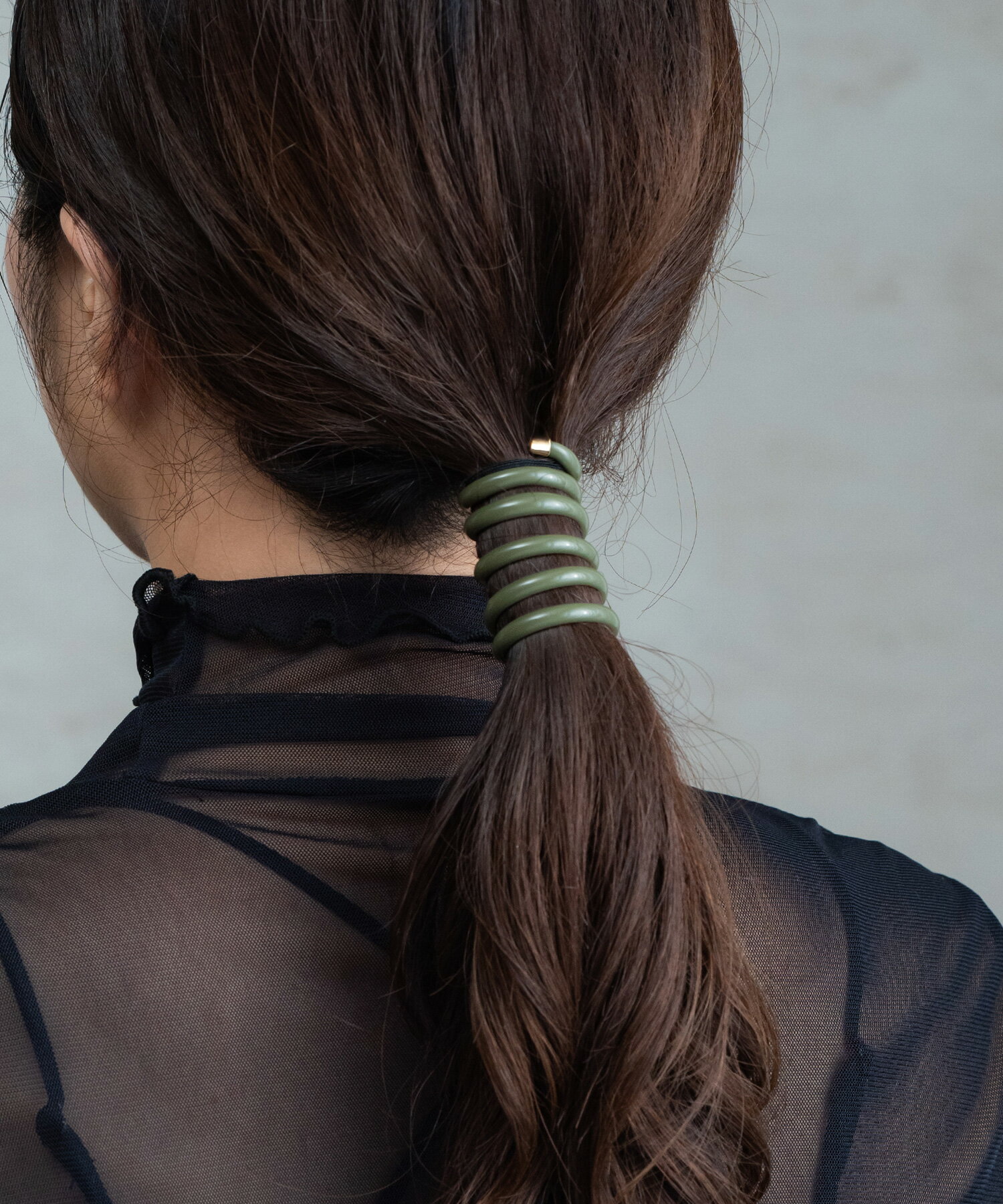 コイルのはじまりに付いているフックを、ヘアゴムで髪を束ねた部分に差し込んで、コイルを巻き付けるだけで完成です。