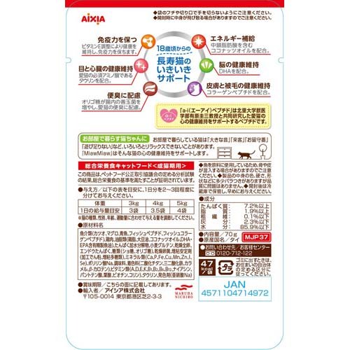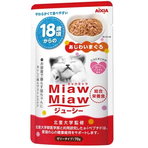 お店TOP>猫用品>キャットフード(ウェット)>高齢猫用ウェットフード>その他ブランド>MiawMiawジューシー 18歳頃からのあじわいまぐろ (70g*12袋入*8箱セット)【MiawMiawジューシー 18歳頃からのあじわいまぐろの商品詳細】●おいしさあふれるジューシーゼリータイプのレトルトパウチ。
