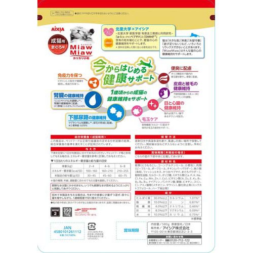 お店TOP>ペット用品>猫用食品(フード・おやつ)>キャットフード(ドライフード・総合栄養食)>キャットフード全部>MiawMiaw カリカリ小粒 まぐろ味 (580g*12袋セット)【MiawMiaw カリカリ小粒 まぐろ味の商品詳細】●「a-iペプチド」と「DMHFを含むおいしい香り」がお部屋で暮らす愛猫の心の健康維持をサポート。