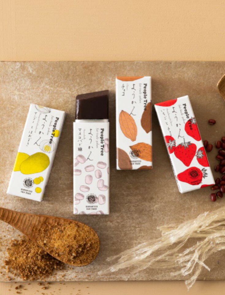 シンプルなマスコバド糖ようかんをはじめ、おなじみのフェアトレード&オーガニックチョコや、アフリカのドライフルーツを加えた、バラエティある4種のラインナップ。