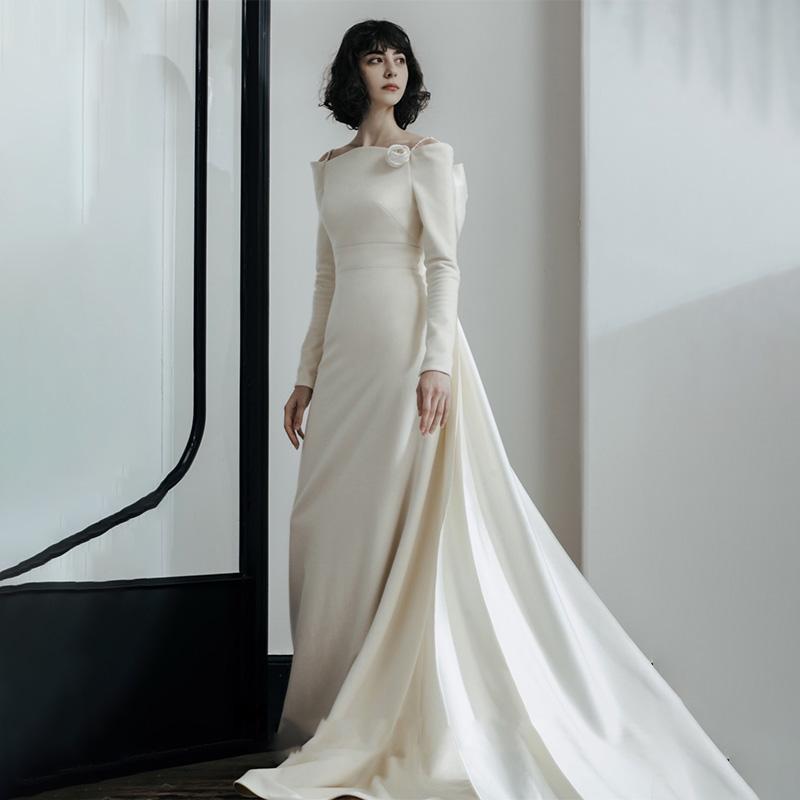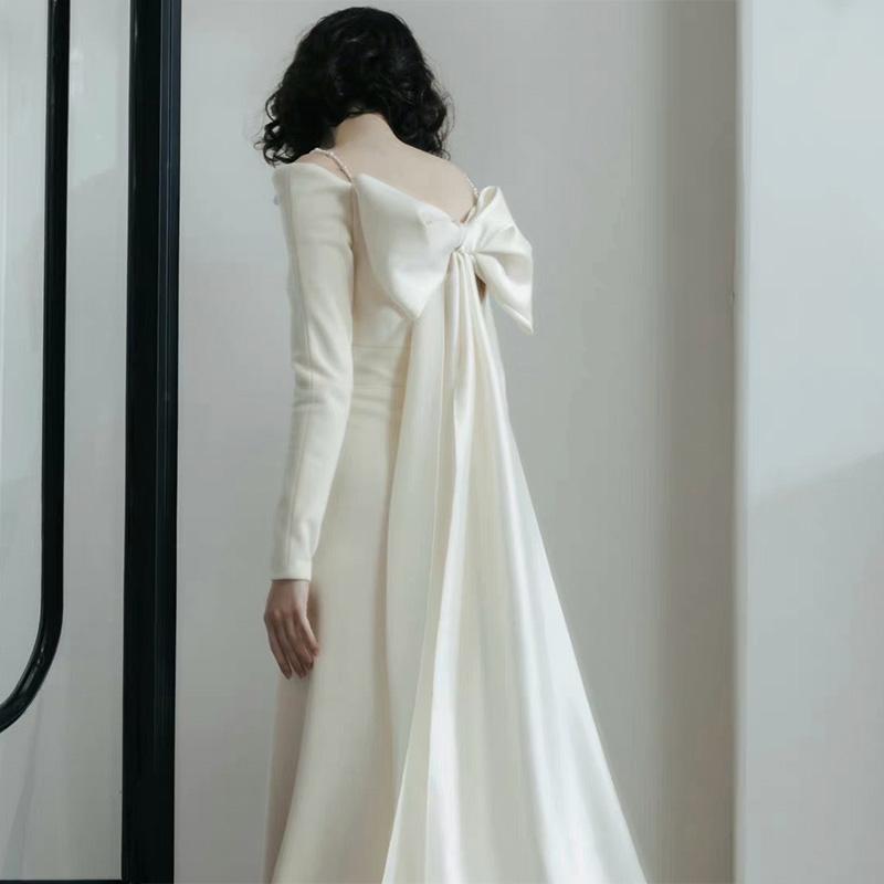 ウェディングドレス ウエディングドレス 二次会 結婚式 前撮り ブライダル ロングドレス 花嫁 スレンダードレス スレンダーライン 白 サテン 長袖 バックリボン 海外挙式 フォトウェディング オフホワイト wedding dress 欧米風 シンプル 小さいサイズ 大きいサイズ