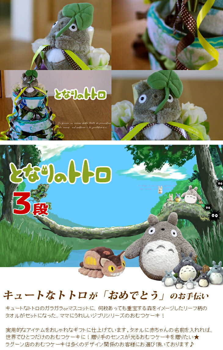おむつケーキ 【トトロ・シリーズ】 となりのトトロ、トトロのおむつケーキ 【商品概要】 キュートなトトロのガラガラorマスコットに、何枚あっても重宝する森をイメージしたリーフ柄のタオルがセットになった、ママにうれしいジブリシリーズのおむつケーキ! おむつは、パンパース18枚が付いてお買得♪