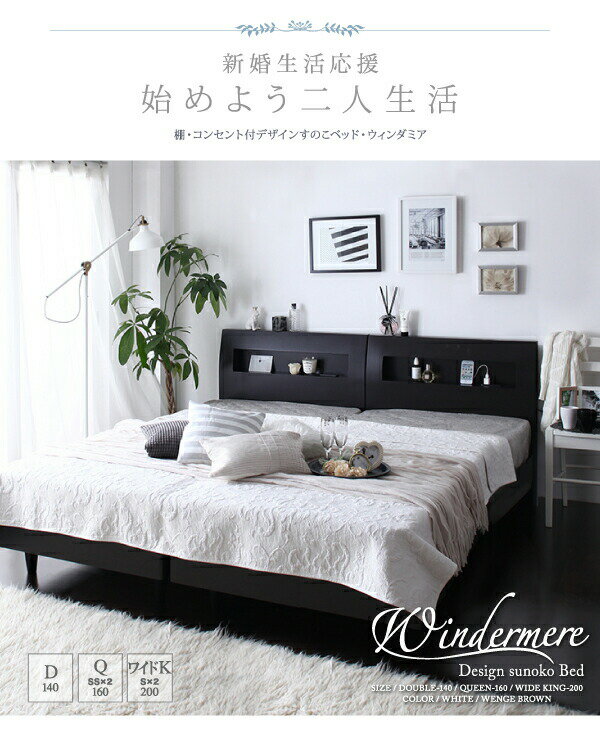 棚・コンセント付きデザインすのこベッド スタンダードポケットコイルマットレス付き クイーン(SS×2)