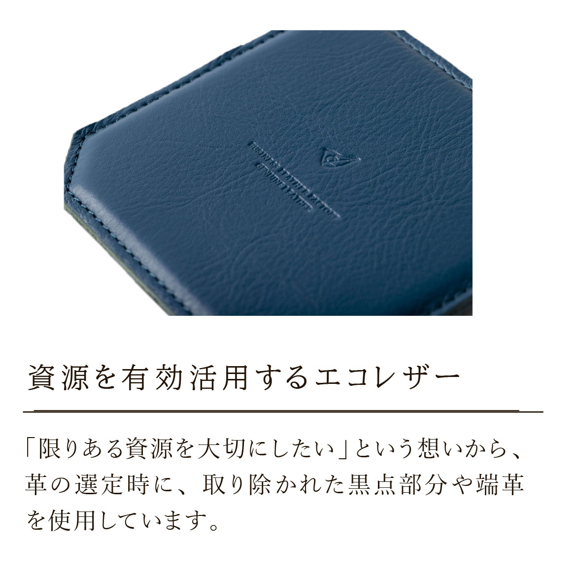 サイズ 高さ10.0cm×幅10.0cm 重さ 21g エコレザーの特徴 革の選定時に、取り除かれた黒点部分や端革を使用し、小さな商品をつくっています。