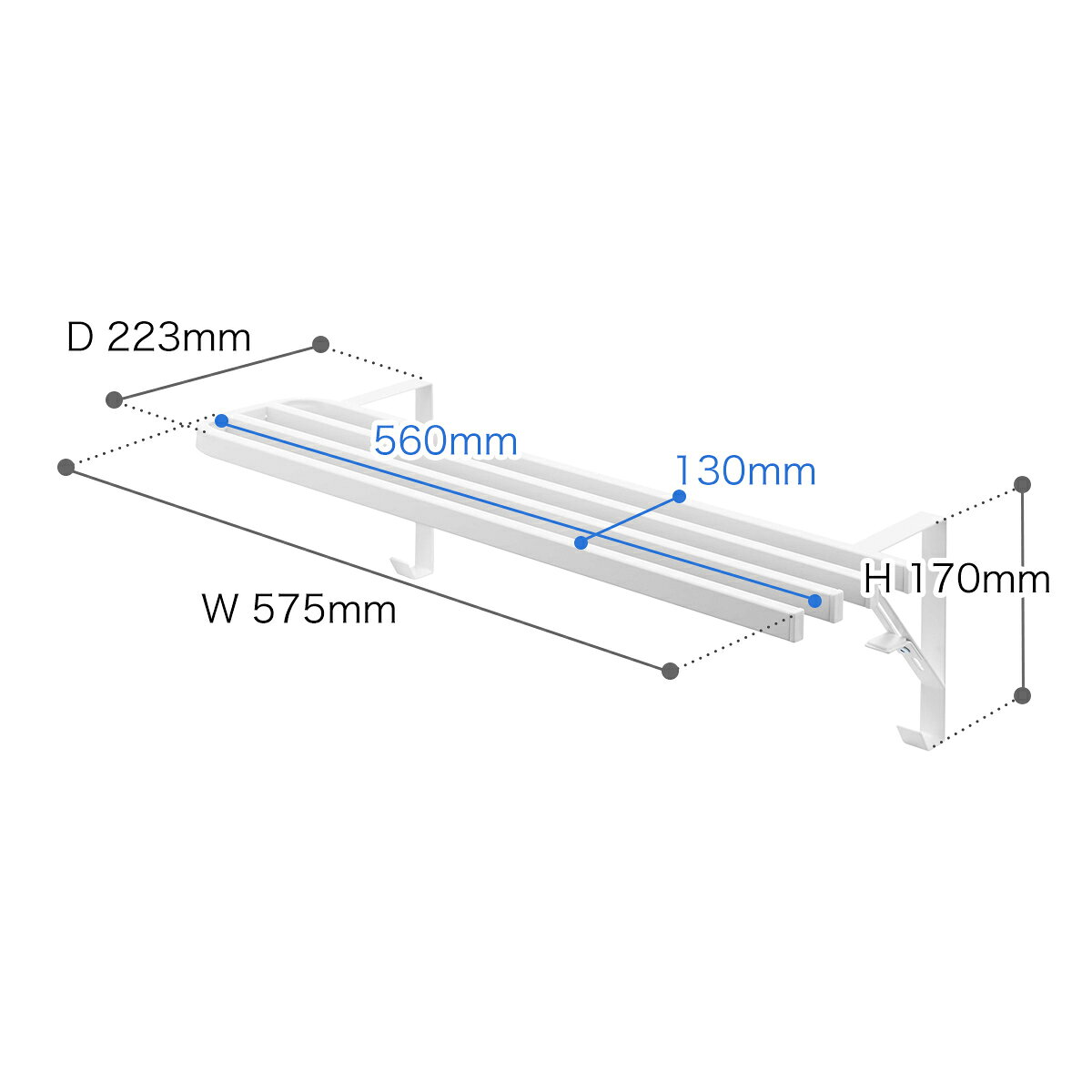 スペック 品番 / JAN ホワイト:5999 / 4903208059992 ブラック:6000 / 4903208060004 サイズ 外寸:約 幅 575mm×奥行き 223mm×高さ 170mm [ 内寸 ] ハンガーの長さ:約 560mmハンガーとハンガーの間:約 30mm 重さ 約 1.35kg 素材 本体:スチール( 粉体塗装 )滑り止め:シリコーン 耐荷重 ハンガー1つあたり:約 500g フック1つあたり:約 250g ※タオルバーの強度や状態によって異なります。