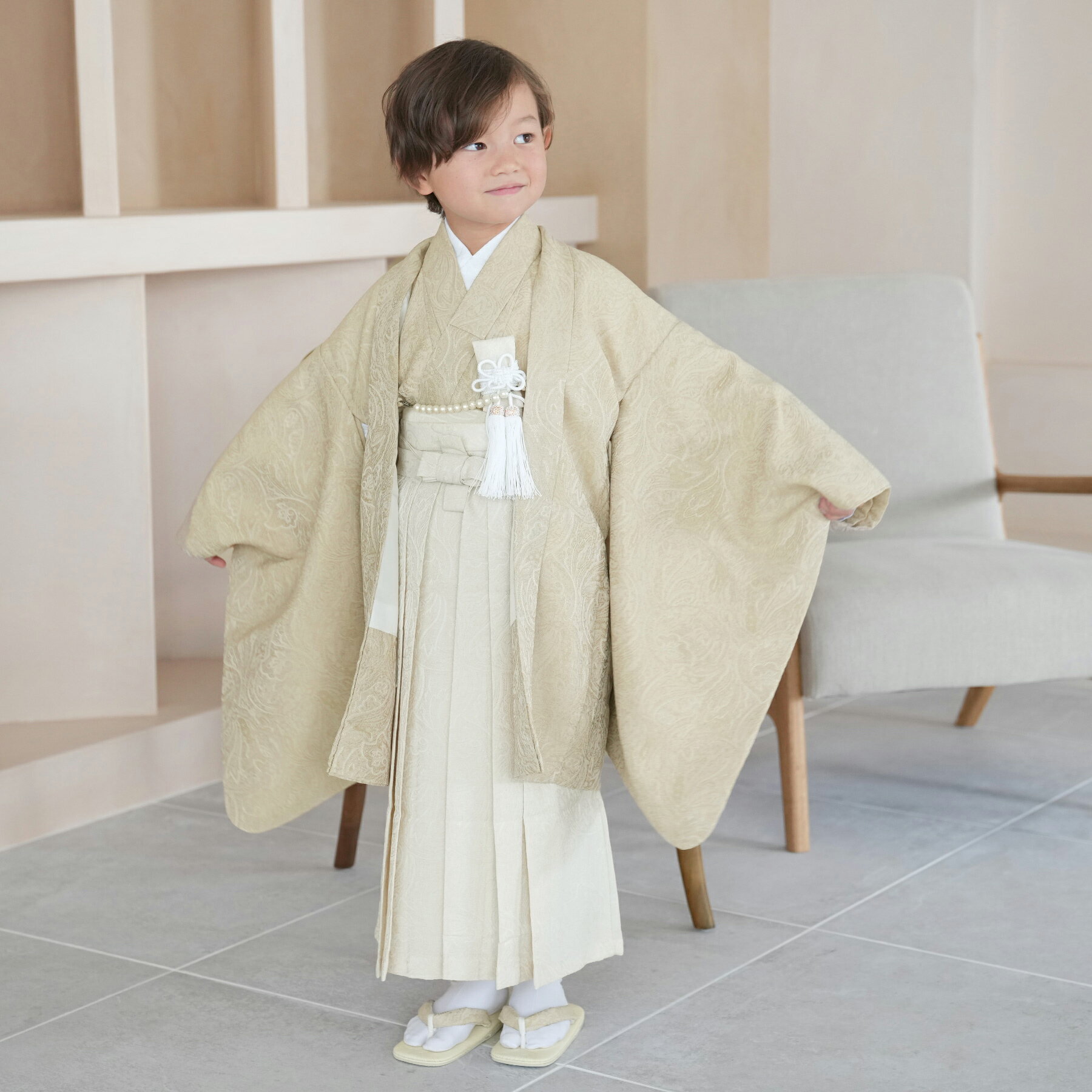 七五三セット utatane 袴60cm(身長105cm-115cm前後) 5歳 袴セット ペイズリー 着物セット 販売 薄いベージュ系 ベージュ 地紋 おしゃれ 袴 お祝い着 五歳 五才 ジャガード 羽織 袴 着物 長襦袢 角帯 御守 懐剣 羽織紐 腰紐 雪駄 足袋 信玄袋
