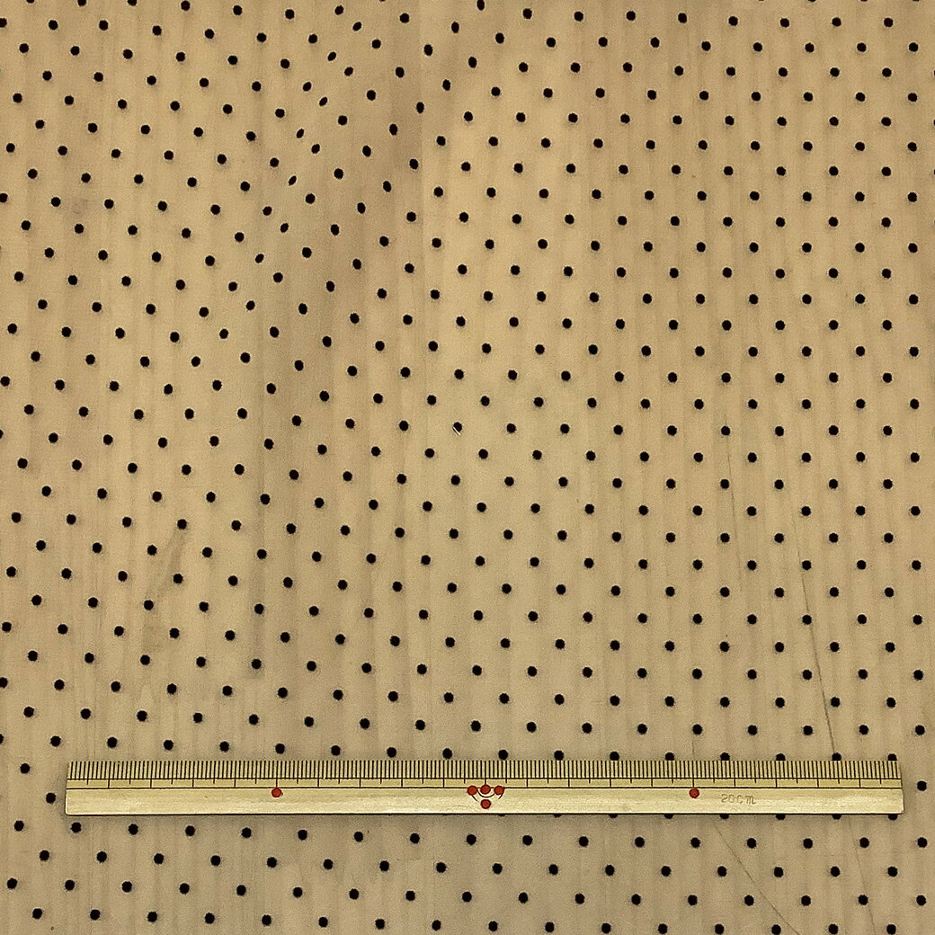 フロッキー加工のシフォン生地 ベージュ地のシフォン生地にフロッキー加工した水玉模様をつけたシンプルな生地。