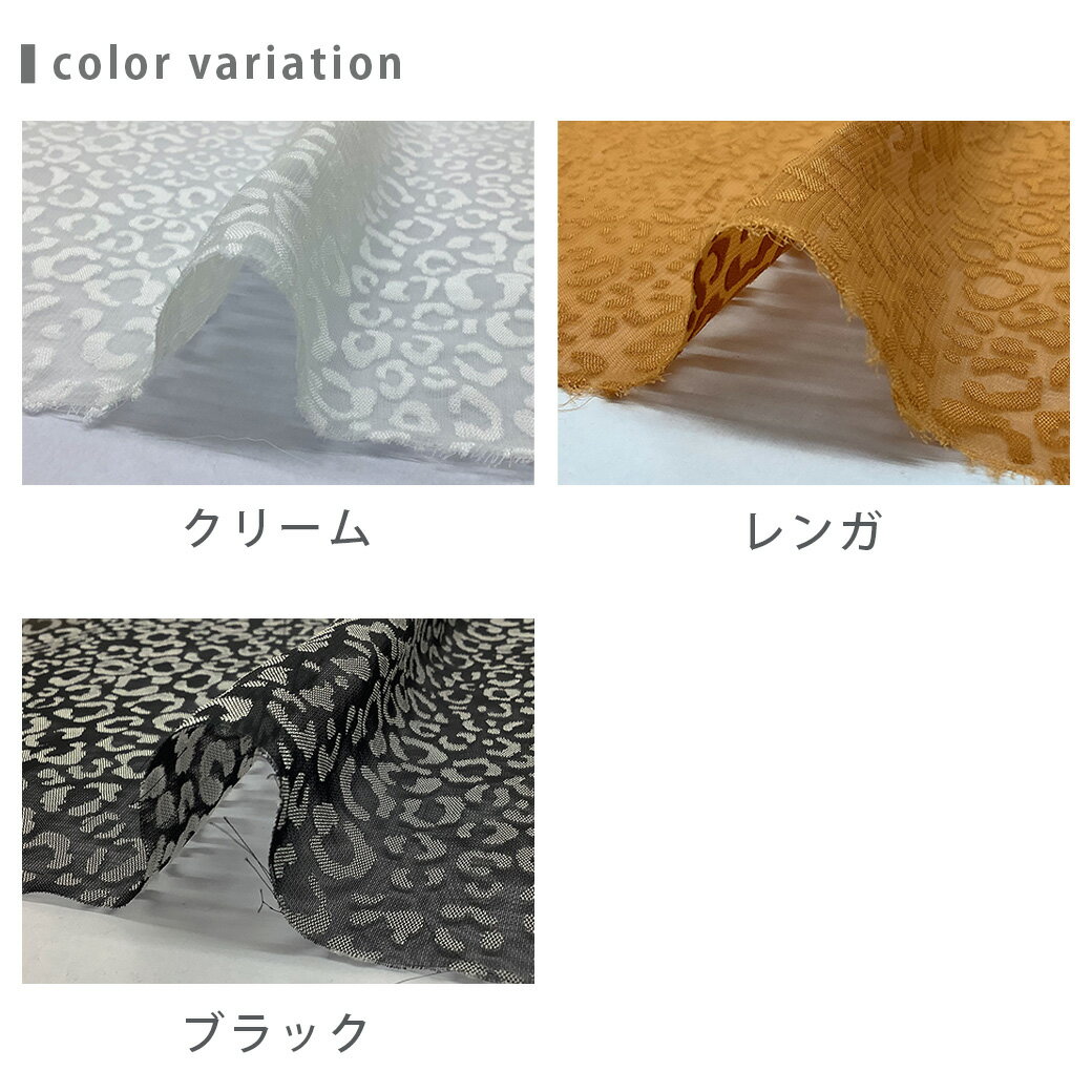 【商品詳細】 商品名 【 レオパード 透け織柄 3色 】 素材ポリエステル100% サイズ 巾112cm カラー クリーム・レンガ・ブラック 販売単位50cm以上10cm単位で販売いたします。