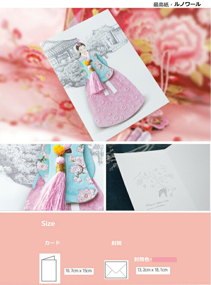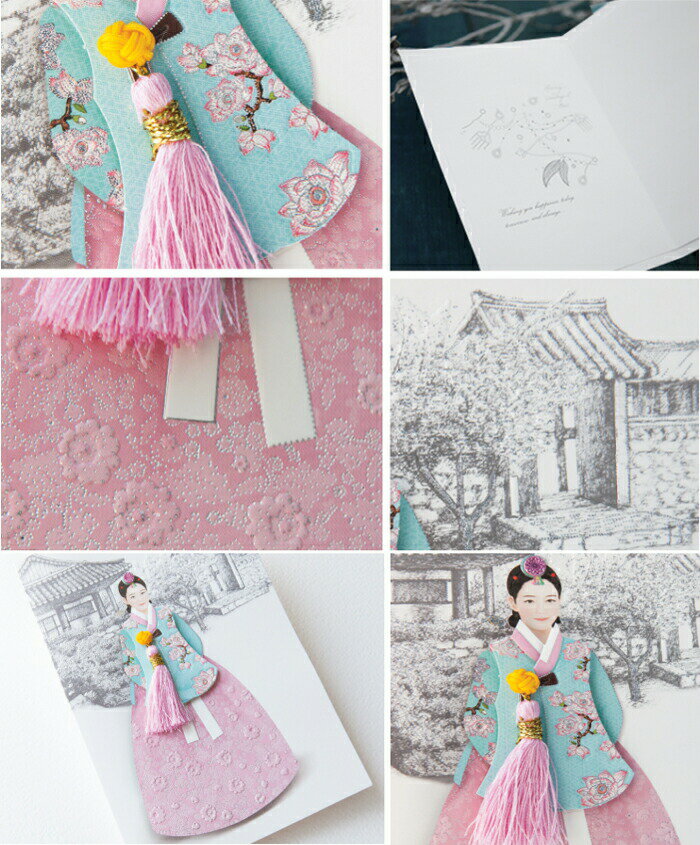 結婚式のご挨拶や招待状、新年を祝うご挨拶、プレゼントやお誕生日のメッセージカードとして、おめでたい日に着る韓服をモチーフにしました。