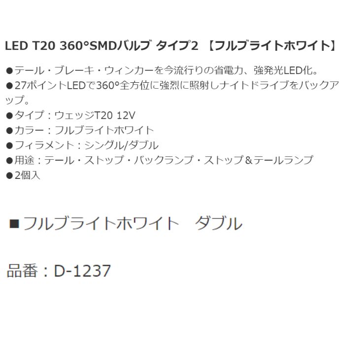 D-1237 T20ウェッジ 送料込 デルタ株式会社360°SMDバルブTYPE2フルブライトホワイト ダブル 2個入り コンビニ受取対応