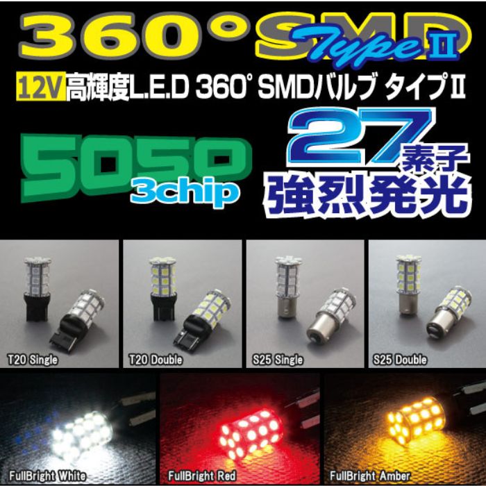 ●360°SMDバルブTYPE2 LED素子には発光力の強い5050SMD(3chip)を採用し、360°全方位を27ポイント照射することにより全体的な光量アップ!従来製品(360°LEDタイプ1)の約2倍の明るさを実現しました。