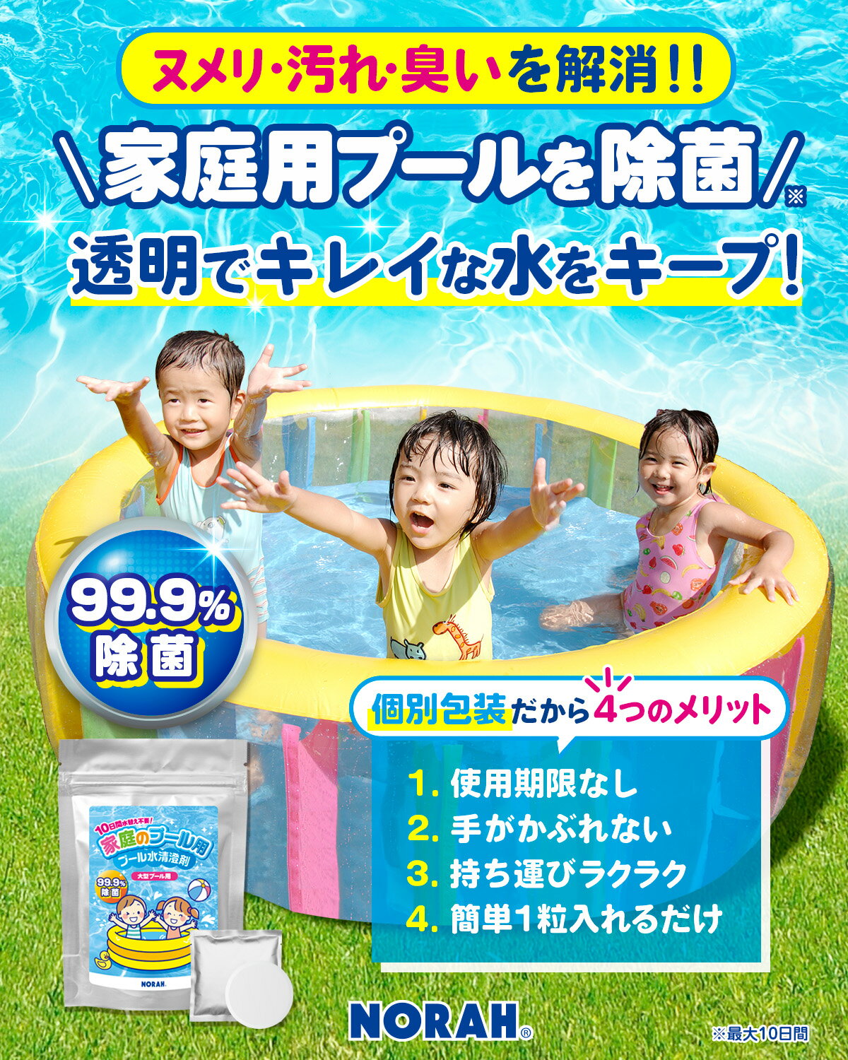 家庭 プール 除菌剤 99.9%除菌 水替え不要 小型 大型 プール用 汚れ ぬめり 臭い 防止 次亜塩素剤 塩素除菌 安心の日本製 個別包装 20錠 NORAH