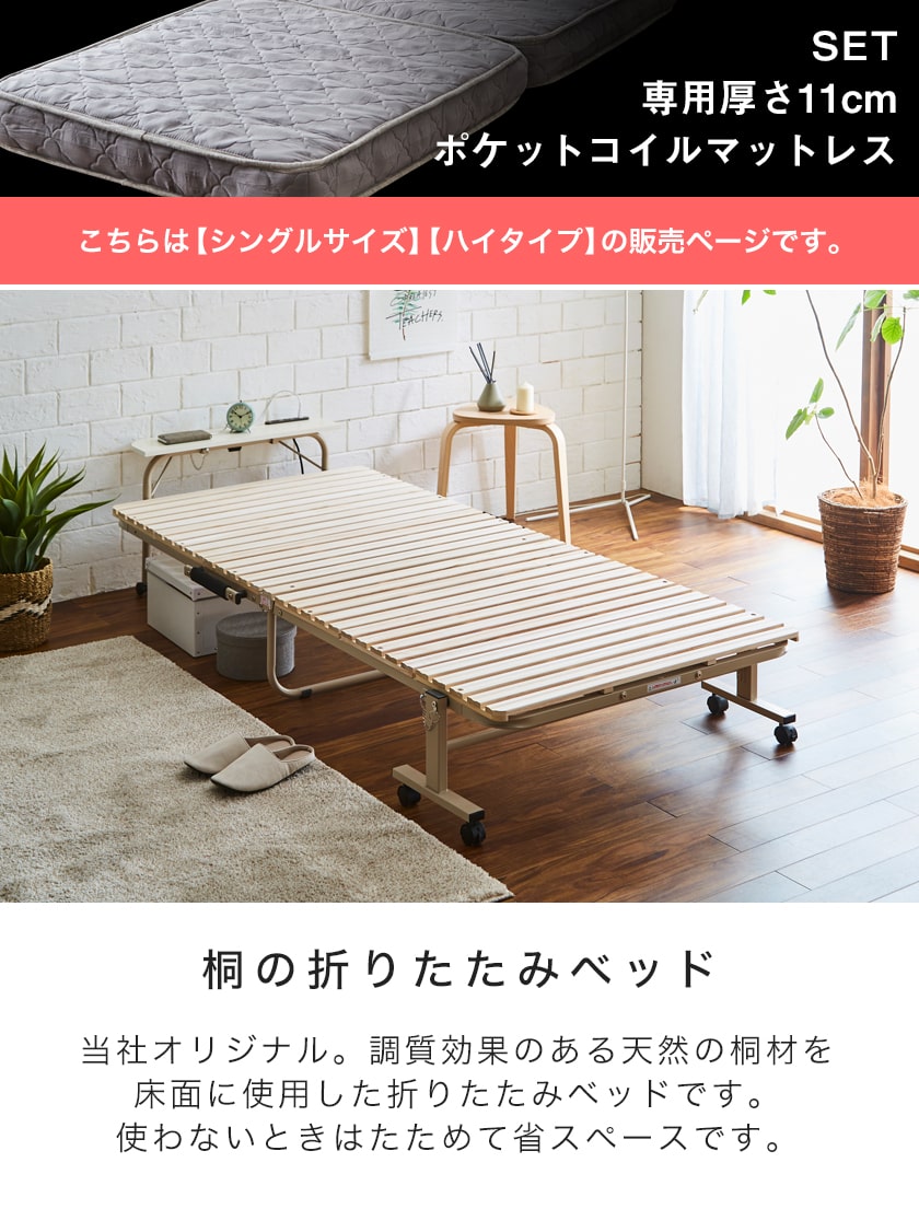 【ポイント10倍★27日9:59まで】 折りたたみベッド 床面高ハイタイプ シングル 厚さ11cm二つ折りポケットコイルマットレスセット スチール製 桐すのこ キャスター付き 棚付き コンセント 安全設計 ブラウン 新商品