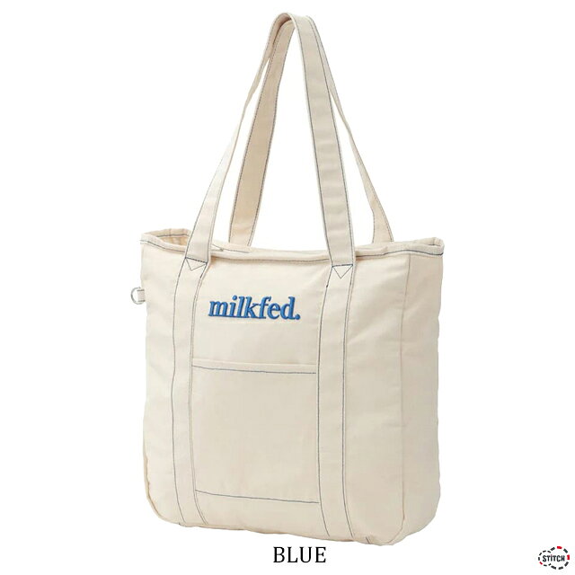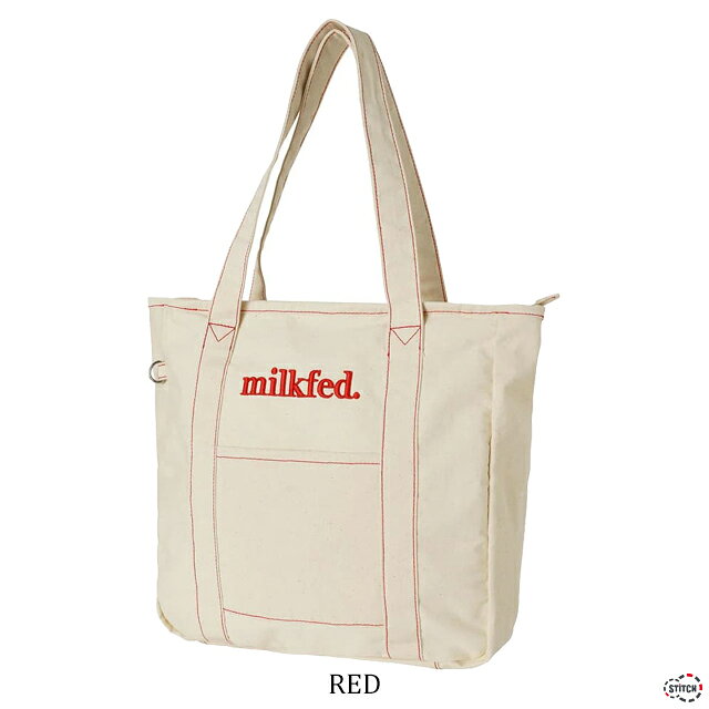 MILKFED. CONTRAST STITCH TOTE BAG 103233053003 コントラスト ステッチ トートバッグ ロゴ アカ アオ 紺 普段使い 大学生 シンプル かばん ブランド かわいい 立体ロゴ ファスナー 仕切りポケット A4サイズ収納可能 配色ステッチ レディース ミルクフェド 正規販売店