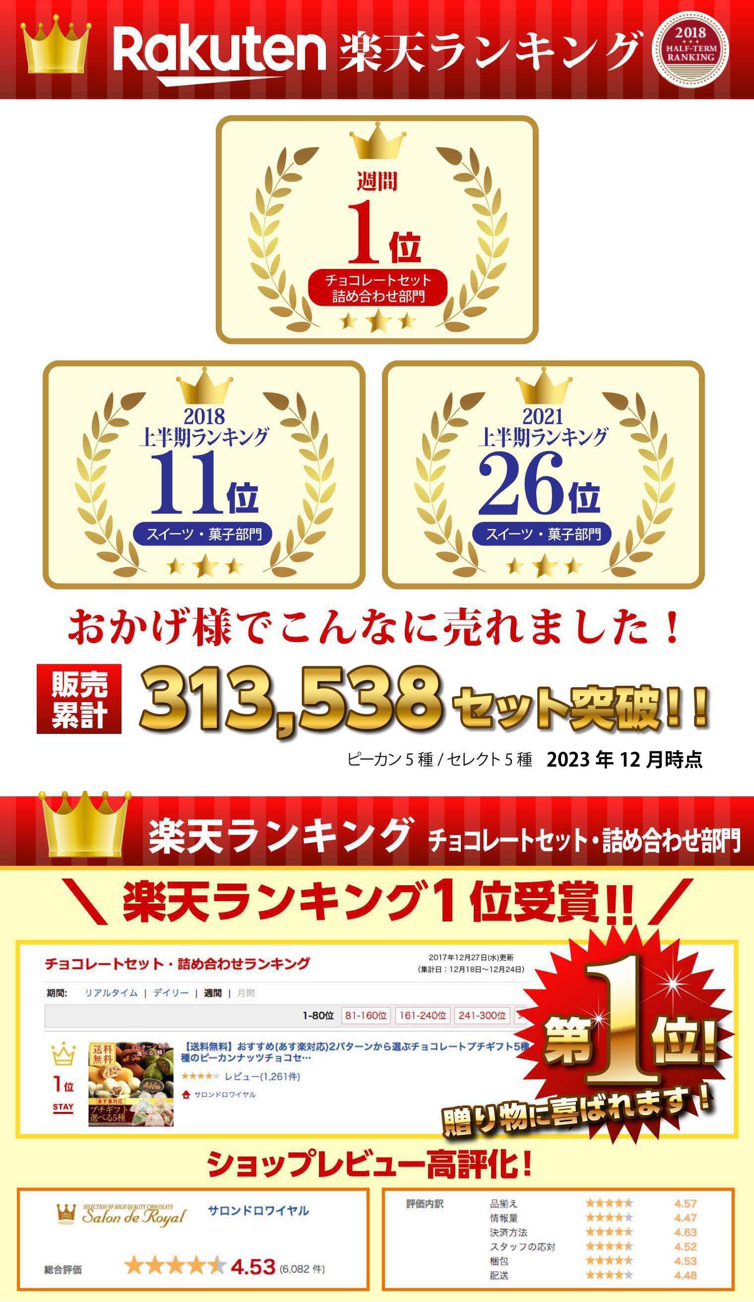 名称チョコレート内容量 【ピーカン5種】240g(16g×3袋×5種)【セレクト5種】キャンディピーカン:48g(16g×3袋)抹茶ピーカン:48g(16g×3袋)ココアがけピーカン:48g(16g×3袋)オーロラアーモンド:60gココアミルク:60g原材料名 【キャンディーコートピーカンナッツチョコレート】ピーカンナッツ(アメリカ産)、ココアバター 、砂糖 、全粉乳、キャラメルパウダー(乳を含む)、乳糖、脱脂粉乳、植物油脂/乳化剤(大豆由来)、香料【ココアがけピーカンナッツチョコレート】ピーカンナッツ(アメリカ産)、砂糖、カカオマス、ココアバター、 全粉乳、ココアパウダー、植物油脂/乳化剤(大豆由来)、香料【抹茶ピーカンナッツチョコレート】ピーカンナッツ(アメリカ産)、砂糖、ココアバター、全粉乳、 抹茶パウダー、乳糖、脱脂粉乳、植物油脂/乳化剤(大豆由来)、香料【オーロラアーモンドチョコレート】アーモンド、砂糖、ココアバター、全粉乳、乳糖、脱脂粉乳、ゼラチン/乳化剤(大豆由来)、香料【ココアミルクチョコレート】砂糖、ココアバター、全粉乳、カカオマス、 ココアパウダー/乳化剤(大豆由来)、香料【黒胡麻ピーカンナッツチョコレート】ピーカンナッツ(アメリカ産)、砂糖、ココアバター、全粉乳、黒胡麻、 乳糖、脱脂粉乳、植物油脂/乳化剤(大豆由来)、光沢剤(シェラック)、香料【小粒塩ピーカンナッツチョコレート】ピーカンナッツ(アメリカ産)、ココアバター、砂糖、全粉乳、食塩、乳糖、脱脂粉乳、植物油脂/乳化剤(大豆由来)、香料保存方法直射日光・高温多湿をさけた28度以下で保存 賞味期限 【ココアミルク】360日【キャンディーコートピーカンナッツ、ココアがけピーカンナッツ、抹茶ピーカンナッツ、小粒塩ピーカンナッツ、黒胡麻ピーカンナッツ】240日【オーロラアーモンド】300日製造・販売者株式会社サロンドロワイヤル〒546-0002 大阪府大阪市東住吉区杭全2−3−15TEL:0120-1-68586 FAX:0120-5-68586 シーンに合わせて様々な贈り物に 日常の贈り物 退職 送別会 御見舞 退院祝い 全快祝い 快気祝い 快気内祝い 御挨拶 ごあいさつ 引越しご挨拶 引っ越し お宮参り御祝 志 進物 プチギフト お土産 ゴールデンウィーク GW 帰省土産 バレンタインデー バレンタインデイ Valentine's day ホワイトデー ホワイトデイ White Day お花見 ひな祭り 端午の節句 こどもの日 スイーツ スィーツ スウィーツ ギフト プレゼント 女子会 パーティ お返し 御礼 お礼 謝礼 御返し お返し お祝い返し 御見舞御礼 ここが喜ばれてます ありがとう プチギフト お世話になりました 個包装 上品 上質 高級 お取り寄せスイーツ おしゃれ 可愛い かわいい 食べ物 銘菓 お取り寄せ 人気 食品 老舗 おすすめ お菓子 ナッツ ピーカンナッツ クーベルチュール チョコレート こんな方に お父さん お母さん 兄弟 姉妹 子供 おばあちゃん おじいちゃん 奥さん 彼女 旦那さん 彼氏 友達 友人 ご近所さん 隣人 先生 職場 上司 部下 取引先 先輩 後輩 同僚