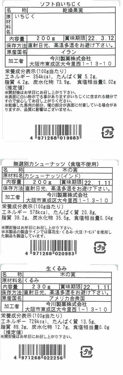大阪 「今川製菓」 ナッツ&ドライフルーツ 3種アソートセット ( ソフト白いちじく185g・無塩カシューナッツ200g・生くるみ230g )