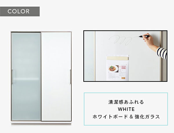 商品情報 材質 MDF 前板:ガラス(飛散防止フィルム貼り) 側面・内側:クリーンイーゴスシート 日本製アルミ オープンスペース:6mmモイス材 サイズ 外寸:幅122×奥行55×高さ194.5cm 左引き戸上段内寸(固定棚より上段):幅63×奥行39.5×高さ45.5cm 左引き戸上段内寸(固定棚より下段):幅63×奥行47.5×高さ45.5cm 左引き戸下段内寸(固定棚より上段):幅63×奥行39.5×高さ40.5cm 左引き戸下段内寸(固定棚より下段):幅63×奥行47.5×高さ40.5cm 右引き戸上段内寸(固定棚より上段):幅52×奥行45.5×高さ35.5cm 右引き戸上段オープンスペース内寸(固定棚より下段):幅52×奥行45.5×高さ51cm 右引き戸下段オープンスペース内寸:幅52×奥行45.5×高さ33cm 右引出内寸:幅48×奥行37.5×高さ18(有効40)cm 色 ホワイト 特徴 ・前面は片面はミスト強化ガラス、片面はホワイトボード仕様なのでメモ代わりにもなり、また中の収納物が見えないのでキッチンまわりをすっきりさせてくれます。
