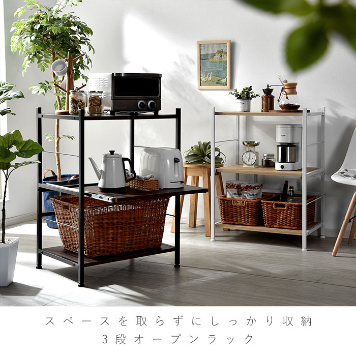商品名オープンレンジラック 3段 ロータイプ アイコニック 取扱タイプブラウン、ナチュラル、ホワイト(白) 商品仕様フレーム:スチール棚板:塩ビ化粧繊維板 耐荷重固定棚:(約)15kgスライド棚:(約)8kg 商品サイズ(約)幅60cm×奥行き45cm×高さ83.5cmアジャスター込み:(約)幅61cm×奥行き45.5cm×高さ83.5cm 商品重量(約)13.3kg 梱包サイズ(約)幅89.5cm×奥行き58.5cm×高さ9.5cm 梱包重量(約)14.4kg 梱包数1個口 生産国中国 組み立てお客様組み立て品 工具軍手・あて布ドライバー六角レンチ(付属)※工具はお客様でご用意ください。