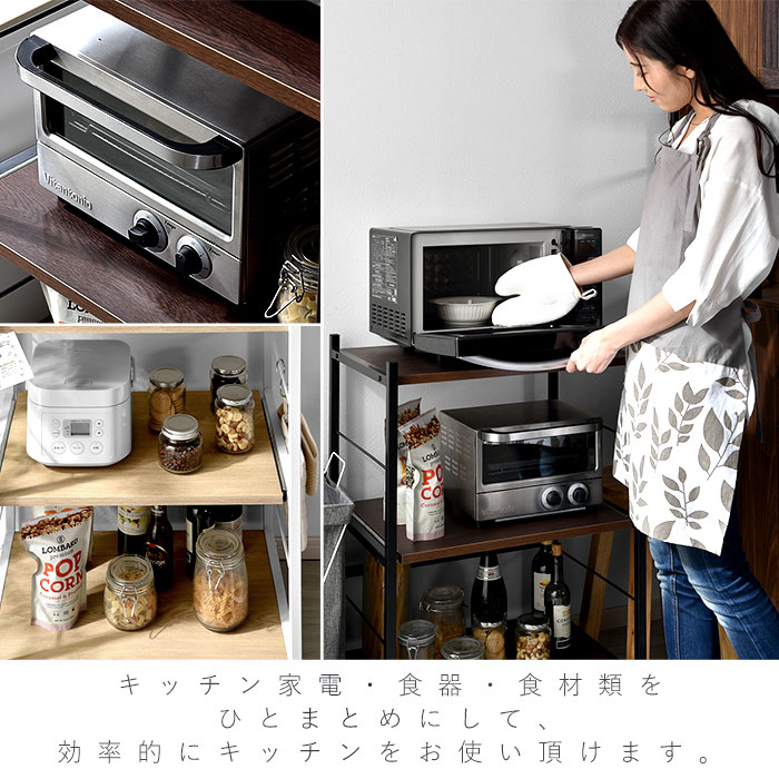 炊飯器やレンジ、オーブンなどのキッチン家電類、食器、食材をひとまとめに収納して、効率的にキッチンをお使いいただけるキッチンラックです。
