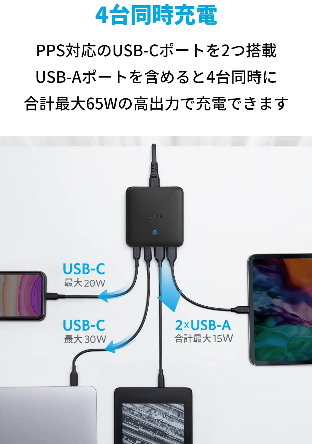 Anker PowerPort Atom III 65W Slim 超薄型デザイン&USB PD(PPS規格)対応の卓上式4ポートUSB急速充電器 4台同時充電 PPS規格に対応したUSB-Cポートを2つ搭載し、USB-Aポートを含めると4台同時に合計最大65Wの高出力で充電できます。