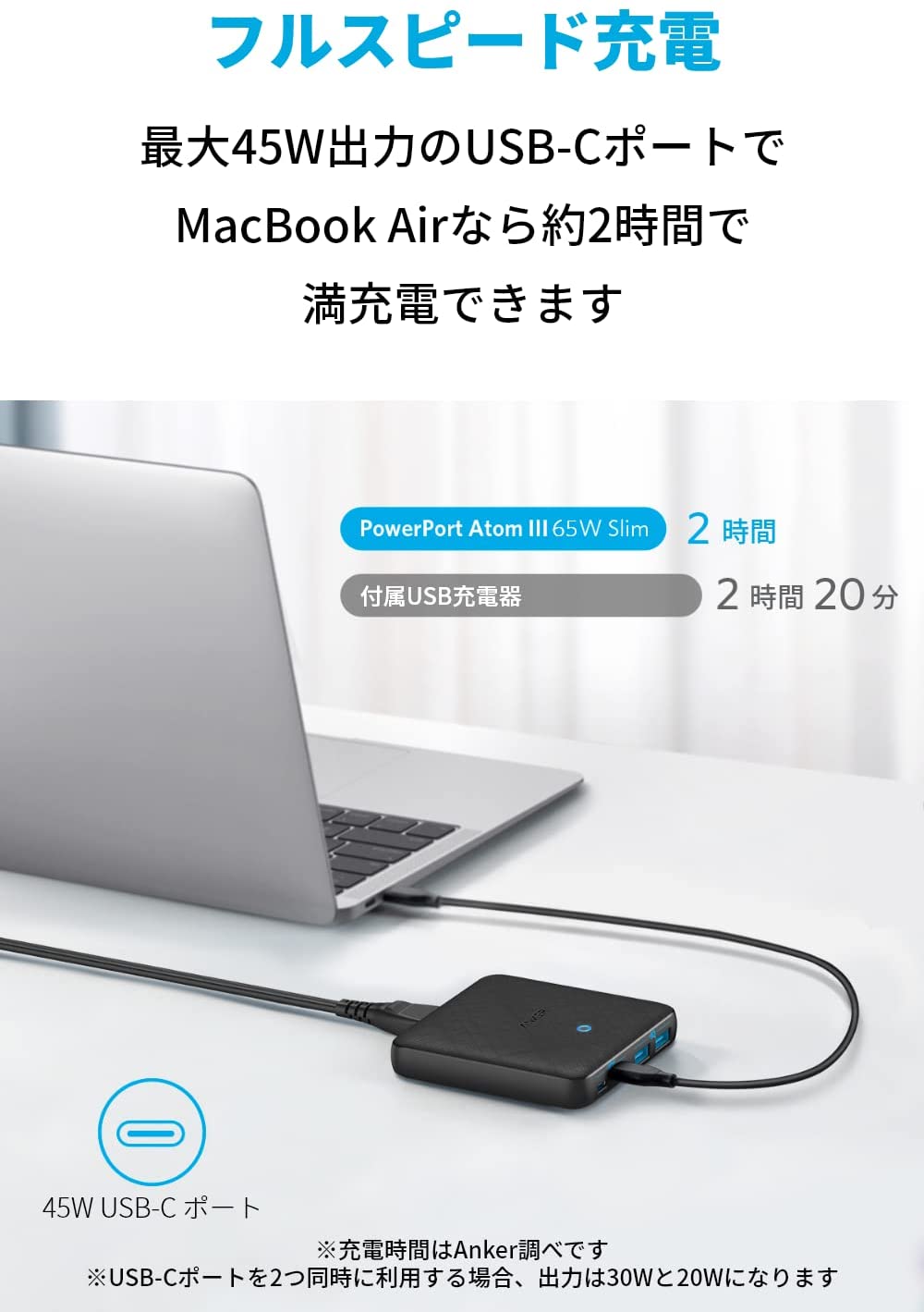 フルスピード充電 最大45W出力のUSB-Cポートで、MacBook Airなら約2時間で満充電できます。