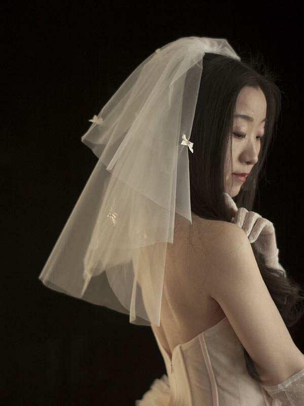 蝶結び 運命の人 シャンパン色ベール ウェディングベール 結婚式 披露宴 セミロング 手作りベール ベールダウン ベールアップ ふんわり 優雅 ビンテージ 海外撮影 旅行結婚 撮影道具
