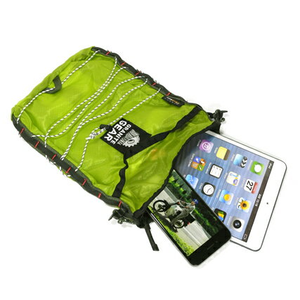 サイドにはミニカラビナ等が付けられるディジーチェーン付き [素材]: 30Dシルナイロンコーデュラ(普通のナイロンの約7倍の強度) [重量]: 約48g [サイズ]: 19.5×25.5×2.5cm [特長]: キーチェーン,バンジーコード,フロントポケット