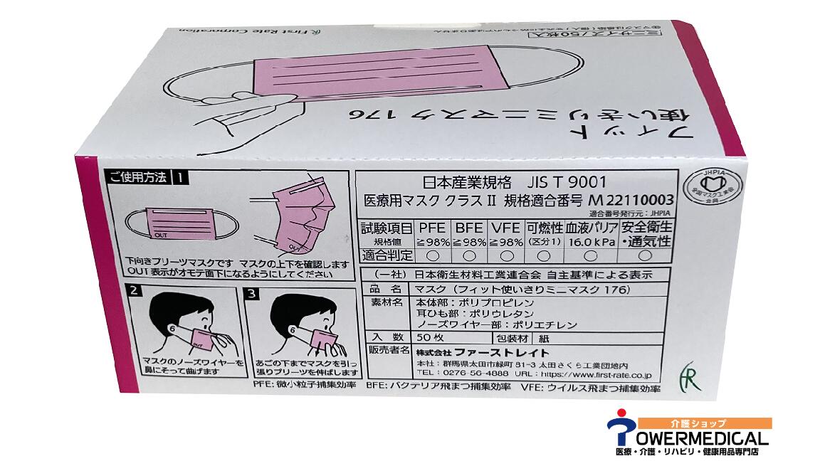 【日本産業規格JIS T 9001】 ・医療用マスク クラスII 規格適合番号 M22110003 【マスク規格】 ・ASTM F2100-11 モデレートバリアクラス(レベル2) ・バクテリア濾過効率(BFE):平均98.5% ・微粒子濾過効率(PFE):平均98.5% 【商品情報】 入数:50枚/1箱 カラー:ピンク 商品サイズ:90×145mm 素材:不織布、ノーズワイヤー内蔵 タイプ:3層式、耳かけタイプ(平ゴム) 形状:プリーツ 生産国:中国製 製造販売元:ファーストレイト ※本製品は、1日に何枚も交換が必要な医療現場採用品のため、ビニール等での個包装とはなっておりません。