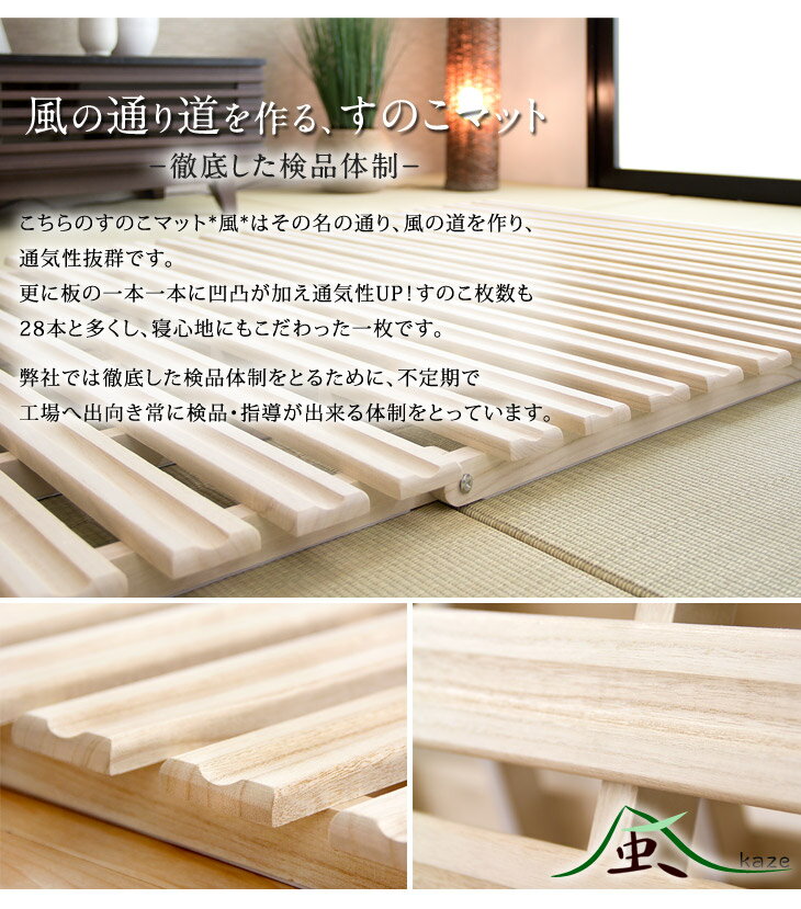 ▼さらにしっかり湿気対策!▼ 敷くだけで簡単除湿センサー付きシート センサー付きすのこ型除湿マット ご一緒にいかがですか?▼へたりにくい!超高密度の洗える布団セット▼ 安心の日本製 6点セット 仕様 サイズ 【シングル】外寸:幅96×奥行き197×高さ約4cm 【セミダブル】外寸:幅120×奥行き197×高さ4cm 【ダブル】外寸:幅140×奥行き196×高さ4cm すのこ厚:1.3cm すのこ幅:5.1cm すのこ間隔:2.1cm 【スタッフサカシナのおすすめポイント!】・布団を湿気・結露から守るすのこマット・すのこ板に凹凸を付けた通気性抜群のリブ加工 ・すのこ枚数はぎっしり28枚!ごつごつ感を軽減 ・耐久性のあるすのこ厚1.3cm・お子様にも安心の低ホルムアルデヒド仕様・二つ折りにして布団干しも楽に!・折りたたみ固定は簡単マジックテープ式 ・キズ防止クッション付き ・搬入ラクラク!コンパクト梱包でお届け 重量 【シングル】約6kg【セミダブル】約7kg【ダブル】約8.5kg 素材 天然桐材キズ防止クッション材:EVA カラーナチュラル 梱包サイズ 【シングル】約11×52×97cm 【セミダブル】約22×50×62cm 【ダブル】約22×50×72cm 生産国中国(ISO9001認定工場で生産) 送料【シングル/セミダブル:沖縄県・離島は送料別途がかかります。