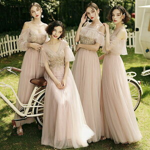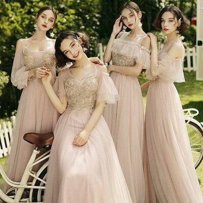 ブライズメイド ドレス ロング丈 フレア袖 肩だし Vネック 長袖 シアー かわいい ラウンド 小さいサイズ 大きいサイズ 結婚式 体型カバー 半袖 フリル オフショルダー ロングドレス 卒業式 ピアノ 発表会 演奏会 20代 30代【XS/S/M/L/XL/2XL】 ピンク