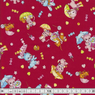 シーチング生地(布)レトロアニマルキャンディー&パラソル柄レッドコスモ【30cm以上10cm単位】