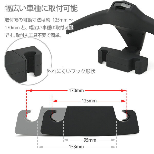 バッグや買い物袋を掛けることもできる多機能ハンガーです仕様(スペック)材質:ABS樹脂カラー:ブラックサイズ:約46cm(横)x約20cm(縦)x約15cm(奥行)取付幅可動寸法:約125~170mmセット内容:本体、説明書(英語版)適合車種汎用品※本製品のサイズを良くご確認の上、ご検討下さい。