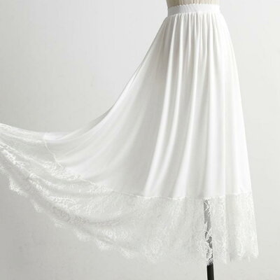 裾にレースをあしらったロング丈ペチコート季節やアウターを問わず着られる、なめらかでとろみ感のある質感。