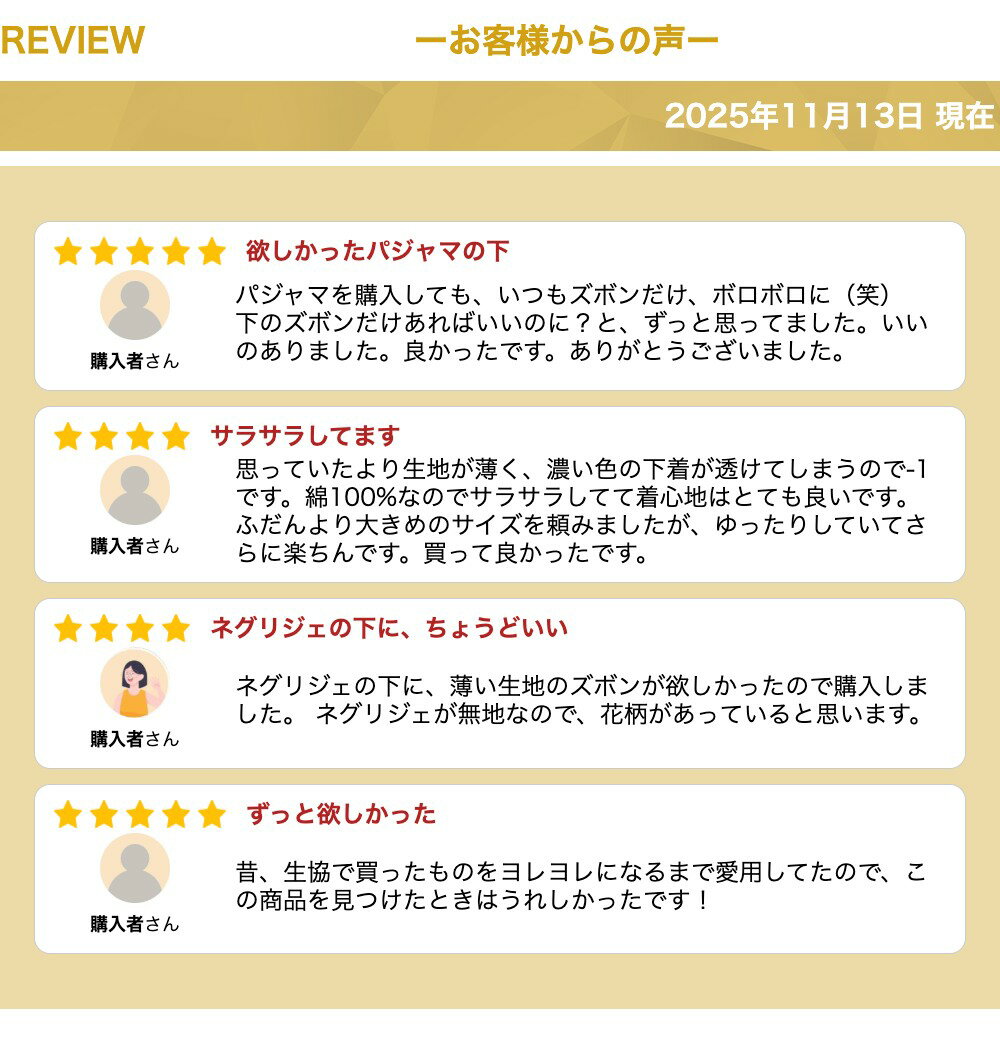 材質: 綿100% サイズ: M:ウエスト64-70cm、股下60cm、裾幅21cm、総丈91cm/L:ウエスト69-77cm、股下61cm、裾幅21cm、総丈93cmLL:ウエスト77-85cm、股下62cm、裾幅22cm、総丈94cm/3L:ウエスト85-95cm股下64c、裾幅22cm、総丈96cm 商品重量: 120g/本(M) 生産国: Made in China 【rakutentera】関連商品夏 涼しい ズボン リラックス 綿 レディース 総ゴム 美脚効果 かわ...レディース パンツ ズボン 暖か 防寒 裏起毛 毛布 おしゃれ ブラッ...高島ちぢみ ズボン リラックス 綿 ボトムス 高島ちぢみ 涼やかパンツ...あったか パンツ 裏起毛 蓄熱素材 ふんわり やわらか 日本製 蓄熱あ...3,578円3,028円3,578円4,678円あったか パンツ 裏起毛 蓄熱素材 ふんわり やわらか 日本製 蓄熱あ...レディース パンツ ズボン 肌にベタつきにくい美脚さらっとパンツ 美脚...レディース パンツ ズボン ボトムス ストレッチ ウエストゴム シルバ...パンツ ズボン 裏フリース 暖か M L LL 伸縮 ウエストゴム お...4,678円3,278円3,358円3,028円レディース パンツ ズボン 裏起毛 寒さ対策 ストレッチ ウエストゴム...パンツ ズボン 裏フリース 暖か M L LL 伸縮 ウエストゴム お...レディース パンツ ズボン ボトムス 高島ちぢみ キュロット ウエスト...レディース パンツ ズボン 涼しい ウエストゴム ポケット付き 綿10...3,028円3,028円3,578円3,578円レディース パンツ ワイドパンツ ゆったり リラックス 麻混リラックス...レディース インナー 肌着 下着 ボトム 7分丈 綿100% 綿ひんや...パンツ ワイドパンツ プリーツ さらさらゆったりプリーツパンツ レディ...レディース パンツ ズボン 綿100%やわらか二重ガーゼパンツ 長ズボ...3,578円2,728円2,728円3,718円夏のパジャマは下だけで十分! 天然素材綿100%の優しい風合いです。
