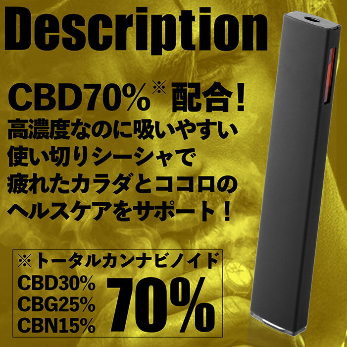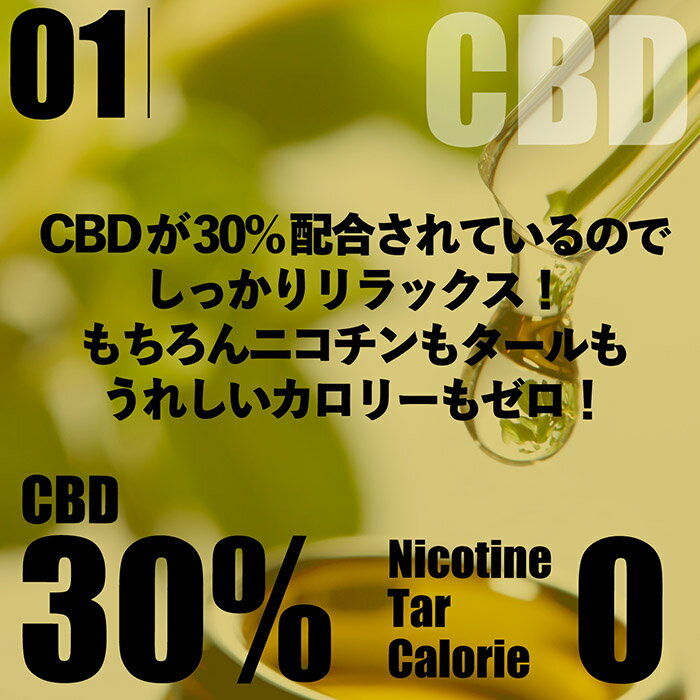 CBD70%配合!※ 高濃度なのに吸いやすい使い切りシーシャで 疲れたカラダとココロのヘルスケアをサポート! ※CBD30%、CBG25%、CBN15%の トータルカンナビノイドの合計した量です ◎CBDが30%配合されているのでしっかりリラックス! もちろんニコチンもタールもうれしいカロリーもゼロ! ◎「最強のカンナビノイド」と呼ばれるCBGを25%配合。