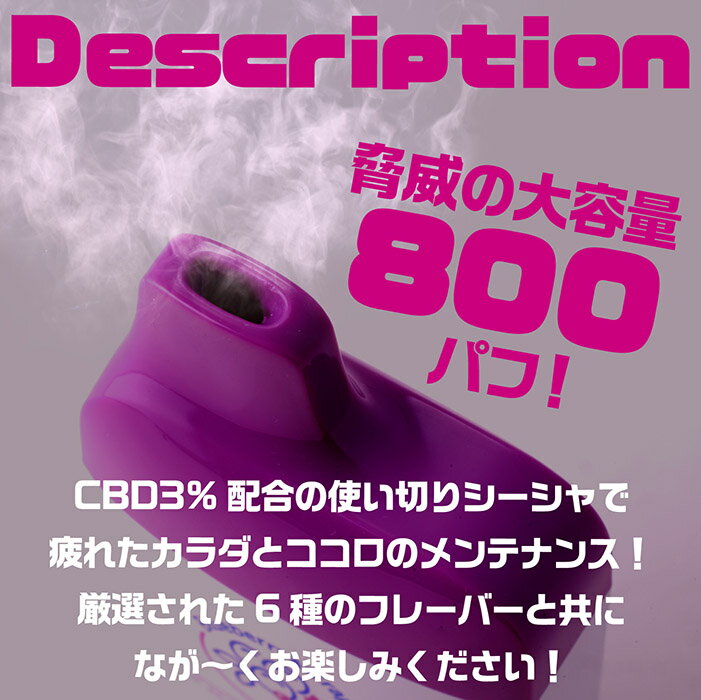 CBD3%配合の使い切りシーシャで 疲れたカラダとココロのメンテナンス! 厳選された6種のフレーバーと共に なが〜くお楽しみください! ◎一本で約800回と脅威の大容量でたっぷり吸えるので とってもうれしいシーシャです! ※吸引の強さによって個人差があります ◎CBDが3%配合されているのでしっかりリラックス! もちろんニコチンもタールもうれしいカロリーもゼロ! ◎持ち歩きに最適なコンパクトサイズだから 歩どこででも楽しめる! ◎厳選された6種のフレーバーで 心ゆくまでお楽しみください! ◎製品仕様 ●サイズ:約 H61 x W38 x D15 mm ●重量:約 28g ●容量:3,5ml ●吸引回数:約 800回程度 ※吸引の強さによって個人差があります ●成分: ・CBD(3%) ・植物性グリセリン ・プロピレングリコール ・香料 ※タール・ニコチンは一切含んでおりません ※本製品は国内で製造されています ●パッケージサイズ:約 W32× H140 × D17 mm ●パッケージ込重量:約 34g ◎注意事項 ・本製品は20歳以上の方の利用を想定しております。