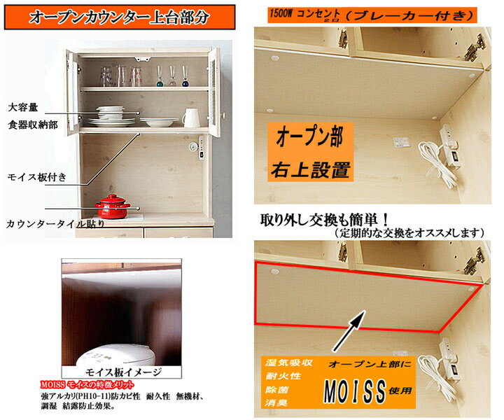 カウンター部上部はモイス天板仕様で炊飯ジャーなどの蒸気も大丈夫スイッチ付きダブルコンセントも備えており家電の使用もバッチリ備考完成品 (上台、下台連結、取っ手各部、簡易組み立て、取り付け必要となります。