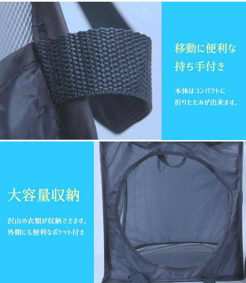 洗濯カゴとしてだけではなくおもちゃ、布団、本・雑誌の収納としての大型収納ボックスです! 【開いた時】:約36×36×60cm【たたんだ時】:約20×20cm 【素材】:テリレン メッシュ素材で濡れてもすぐに乾きます。