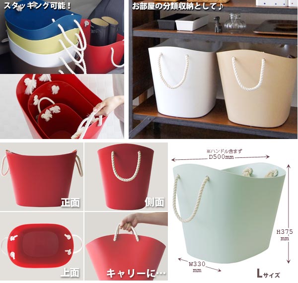 ●入り数:1個 ●本体カラー:白 ●サイズ:約W330×D500×H375mm (※Dサイズはハンドル含まず) ●容量:約38L ●商品重量:約1265g ●材質:ポリエチレン(持ち手:綿) ●使用例:トイボックス、フードストッカー、ランドリーバスケット、ショッピングバッグ、アウトドアの濡れもの入れ etc. ※スタッキングする場合、材質の特性上変形することがありますが、形を整えご使用頂けます。
