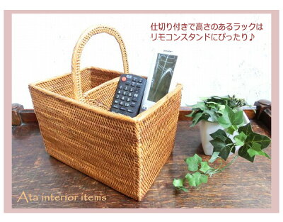 アタ製持ち手付きラック【幅22cm 高さ15cm】マルチラック リモコンスタンド 籠 ナチュラル おしゃれ 収納ラック 収納カゴ 収納かご バリ雑貨 インテリア リゾート バリ島 アタ製品 ブラウン 藤 ラタン ハンドメイド 工芸