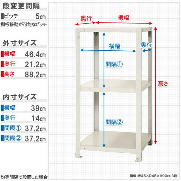 スペック* 材質: スチール製* 商品サイズ: 外寸: 幅46.4×奥行21.2×高さ88.2cm* 棚板枚数3枚* 生産国: 日本